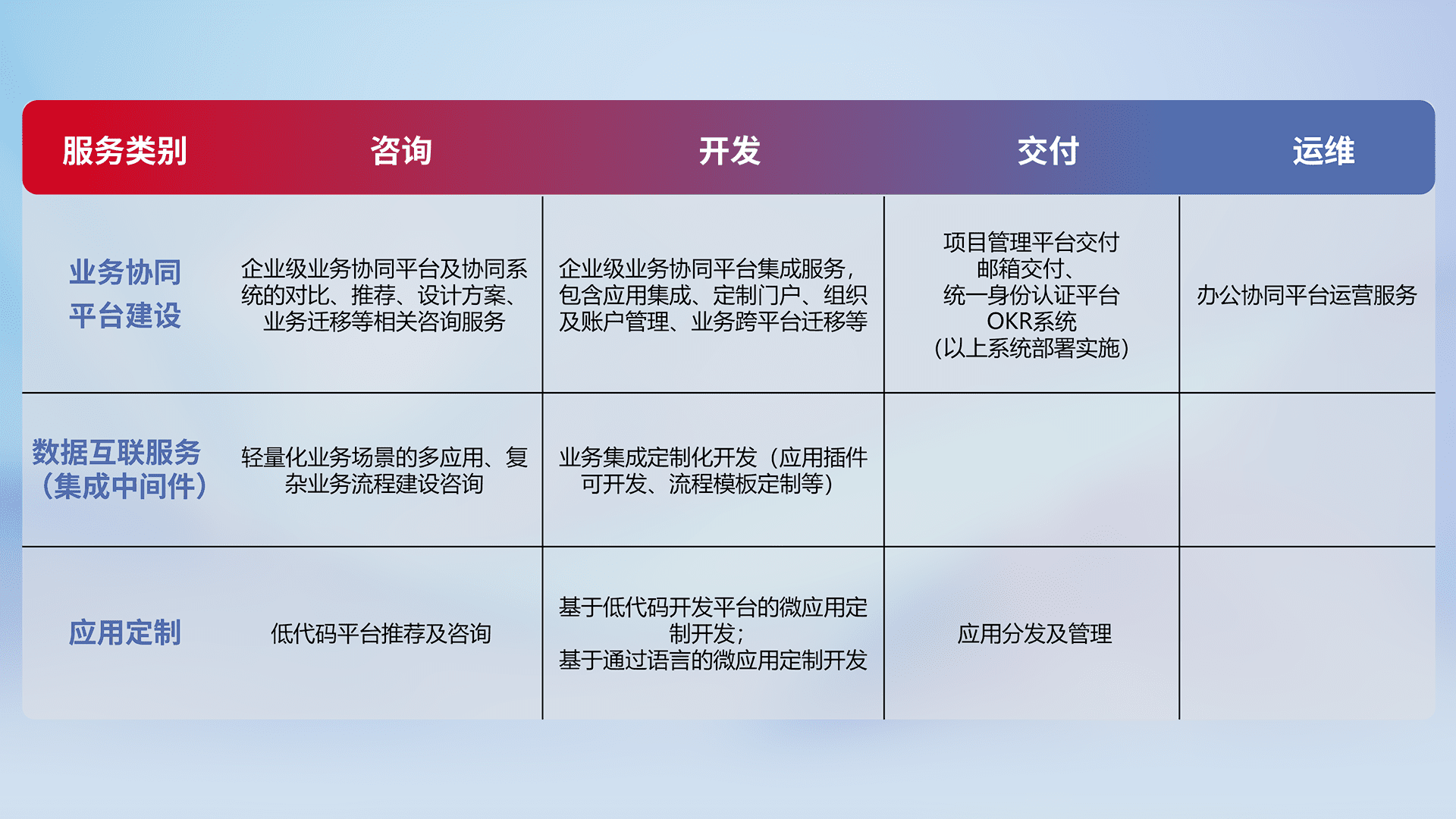 针对钉钉、、、、企微、、、、IDaas等平台级产品提供产品的规划、、、、方案、、、交付、、、定制化开发等服务,,,实现如统一协同办公、、、、智能客户服务、、、、混合会议管理、、、智能数据查询、、等业务场景,,,,实现数字化转型。。。。