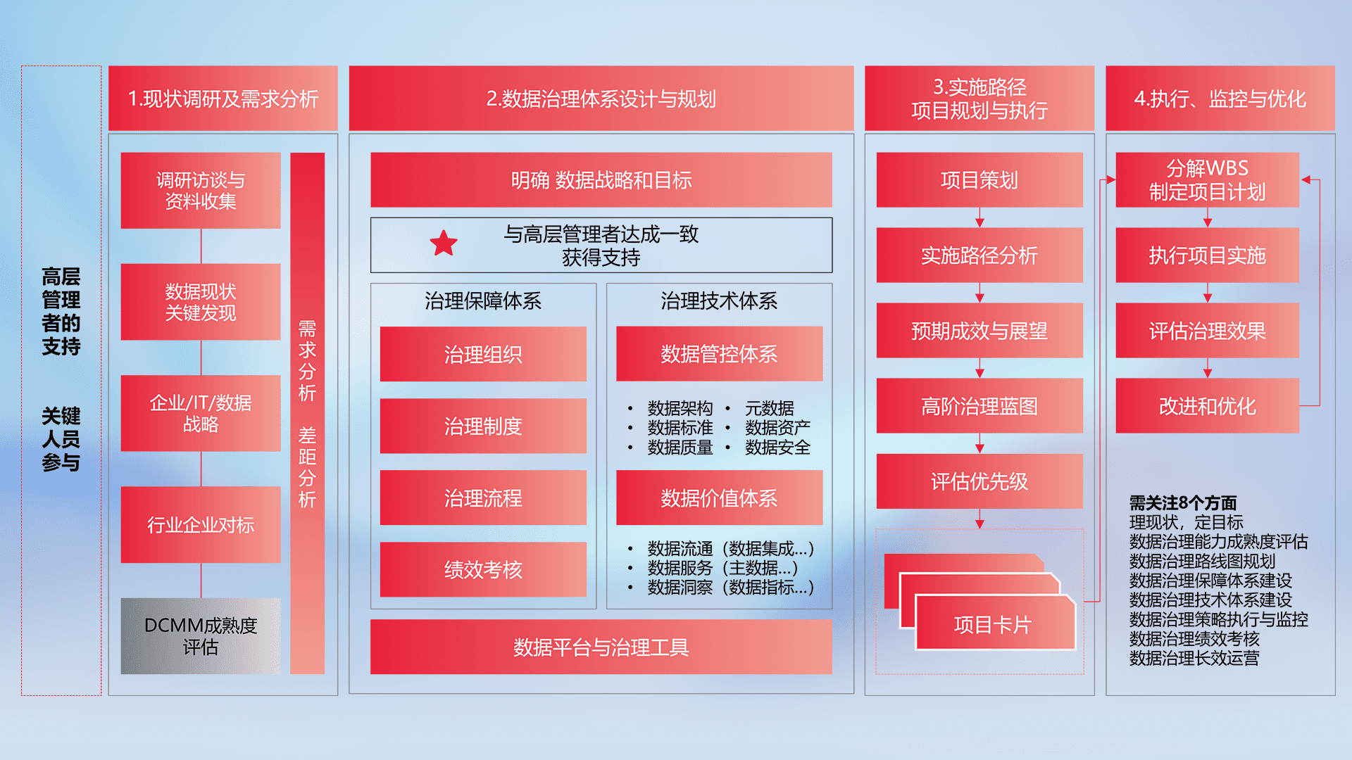 制定并执行统一的数据标准,,,规范数据定义和格式,,,消除冗余和不一致性,,,实现跨部门和跨系统的数据一致性,,,,为企业提供标准化的数据基础。。。